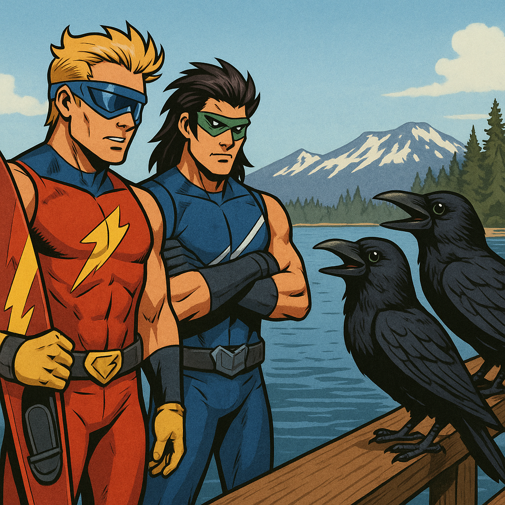 Wake Razor crossed his arms, suspicious but intrigued. “Talking crows, huh? You two friends of the lake or something?”
