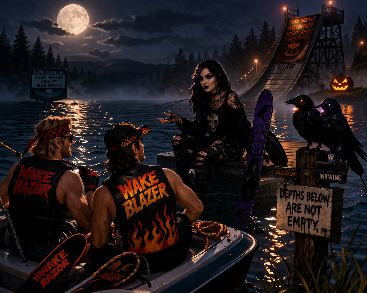 Blazer tilted his head. “You mean on this lake? At night?” Nocturne smirked. “That’s the point. Pend Oreille’s haunted — haven’t you heard? There’s a jump out there that nobody sets anymore. Used to belong to a skier named Crimson Jack. He built it over the trench they call the Drowned Runway. They say Jack went for one last flight, vanished mid-air. People see a shimmer under the surface sometimes, or hear an engine rev with no boat around.”
